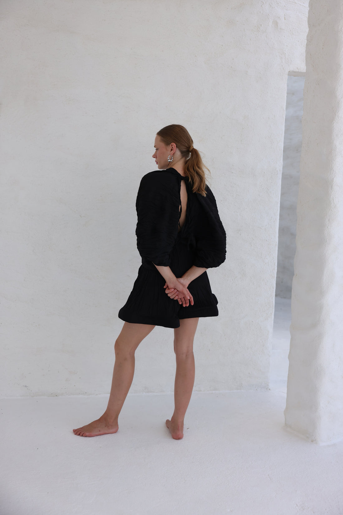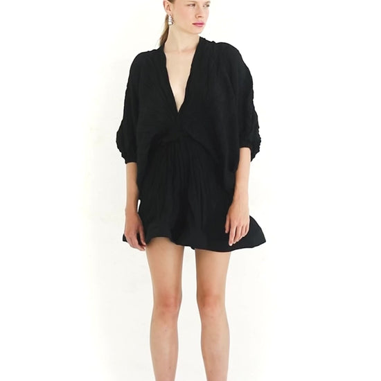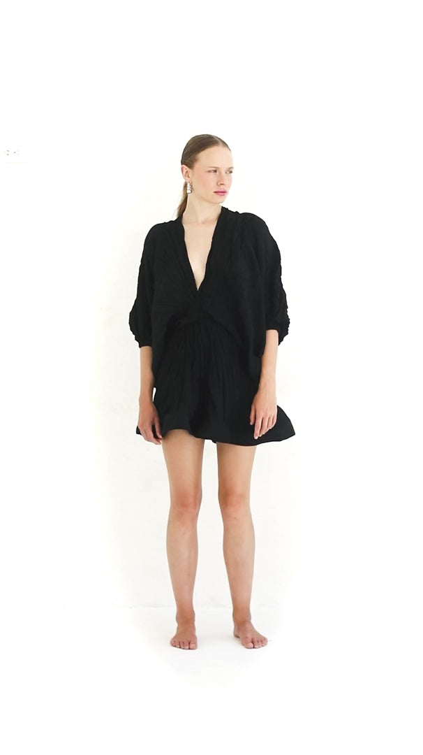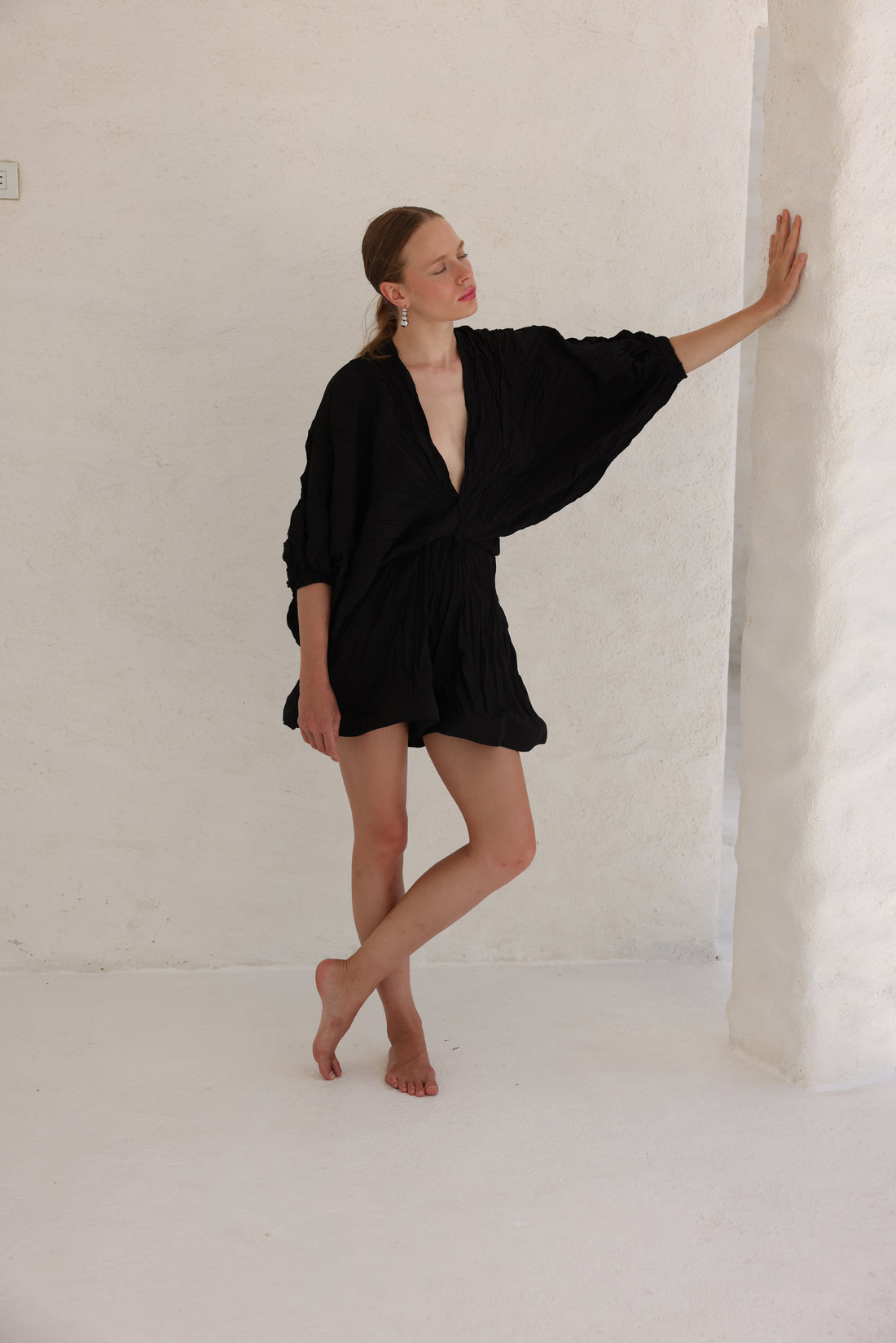 BEST SELLER, enterizo Costa ahora disponible en color negro. Enterizo con mangas en mariposa, escote en V en la parte anterior y posterior. Hecho en tela georgette. Enterizo horma grande.