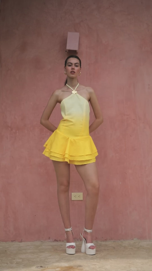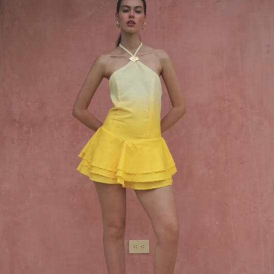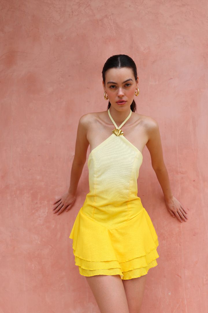 Vestido corto hecho en lino top en halter con detalle dorado y falda en tres vuelos.