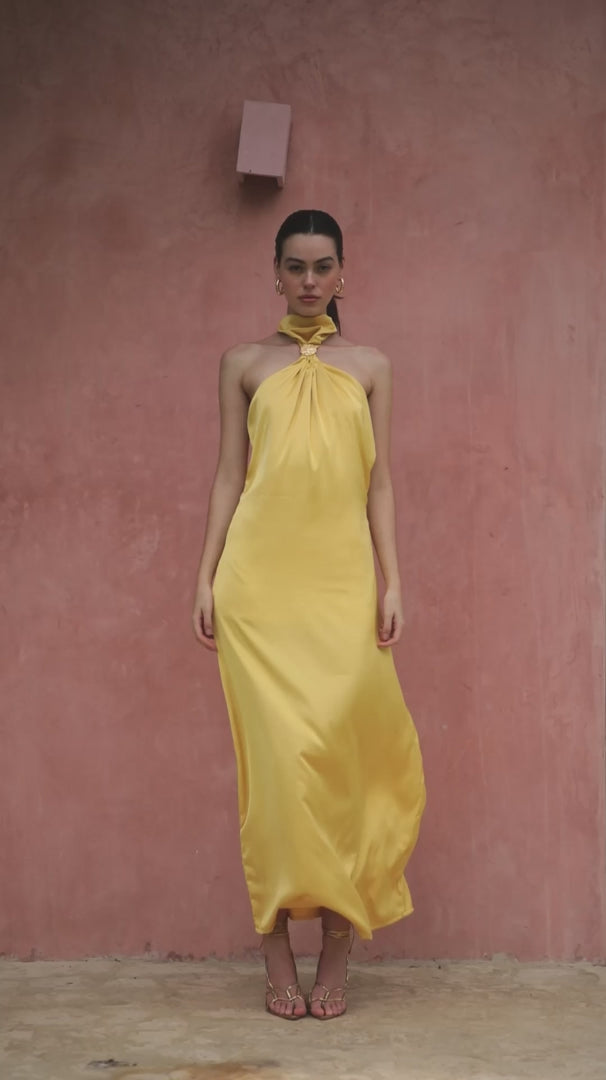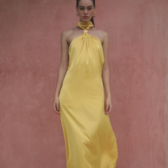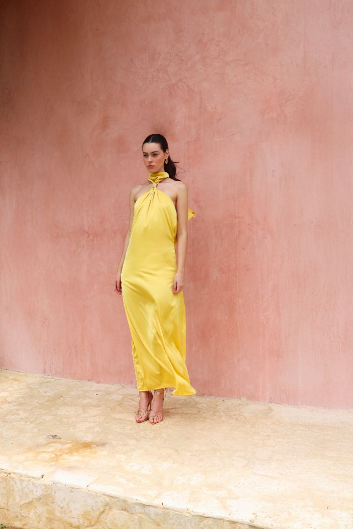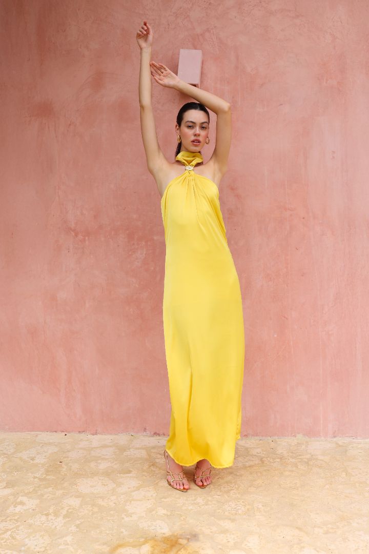 Vestido largo hecho en seda con cuello alto con detalle dorado y espalda afuera.